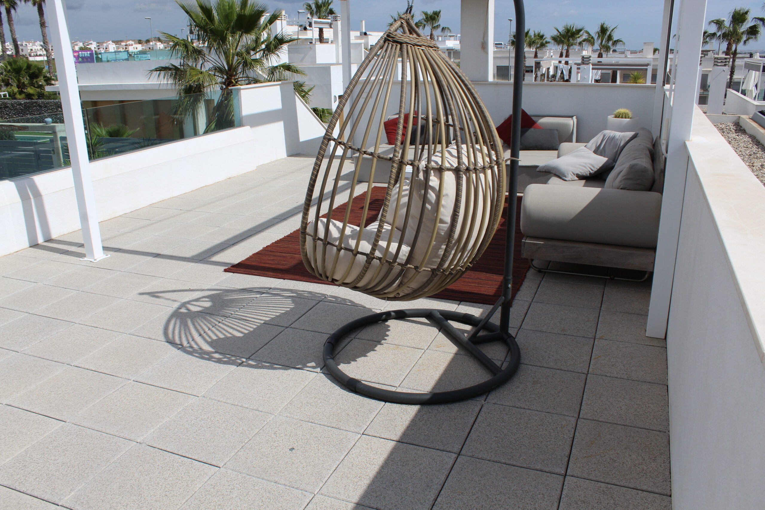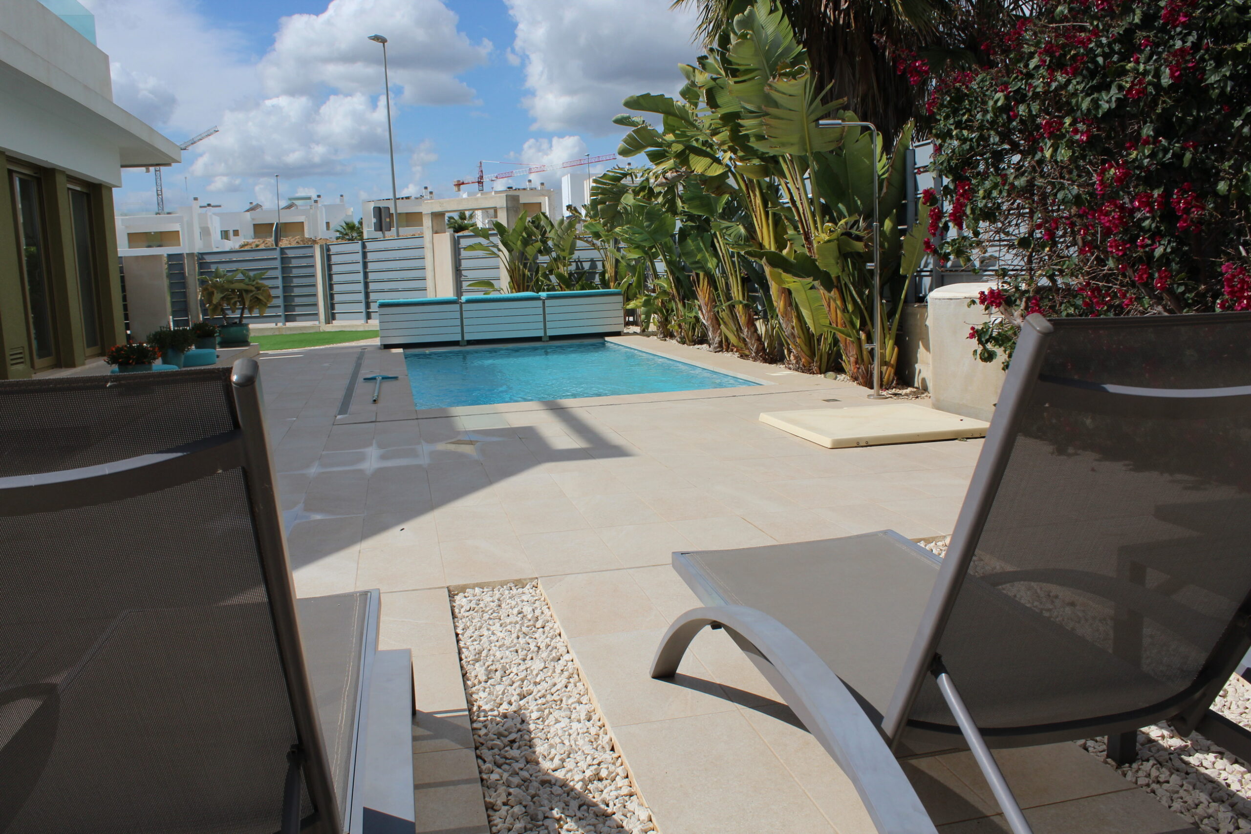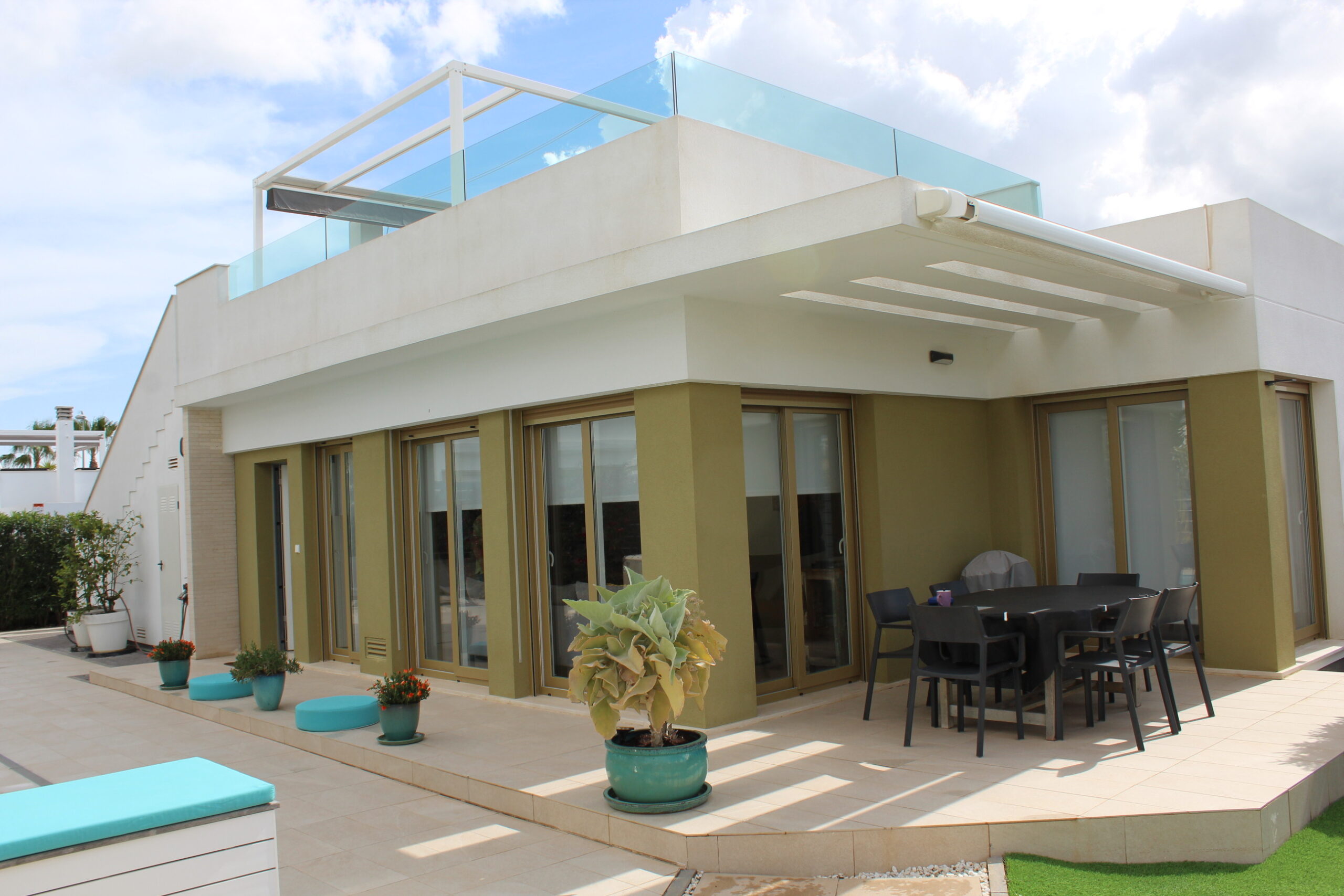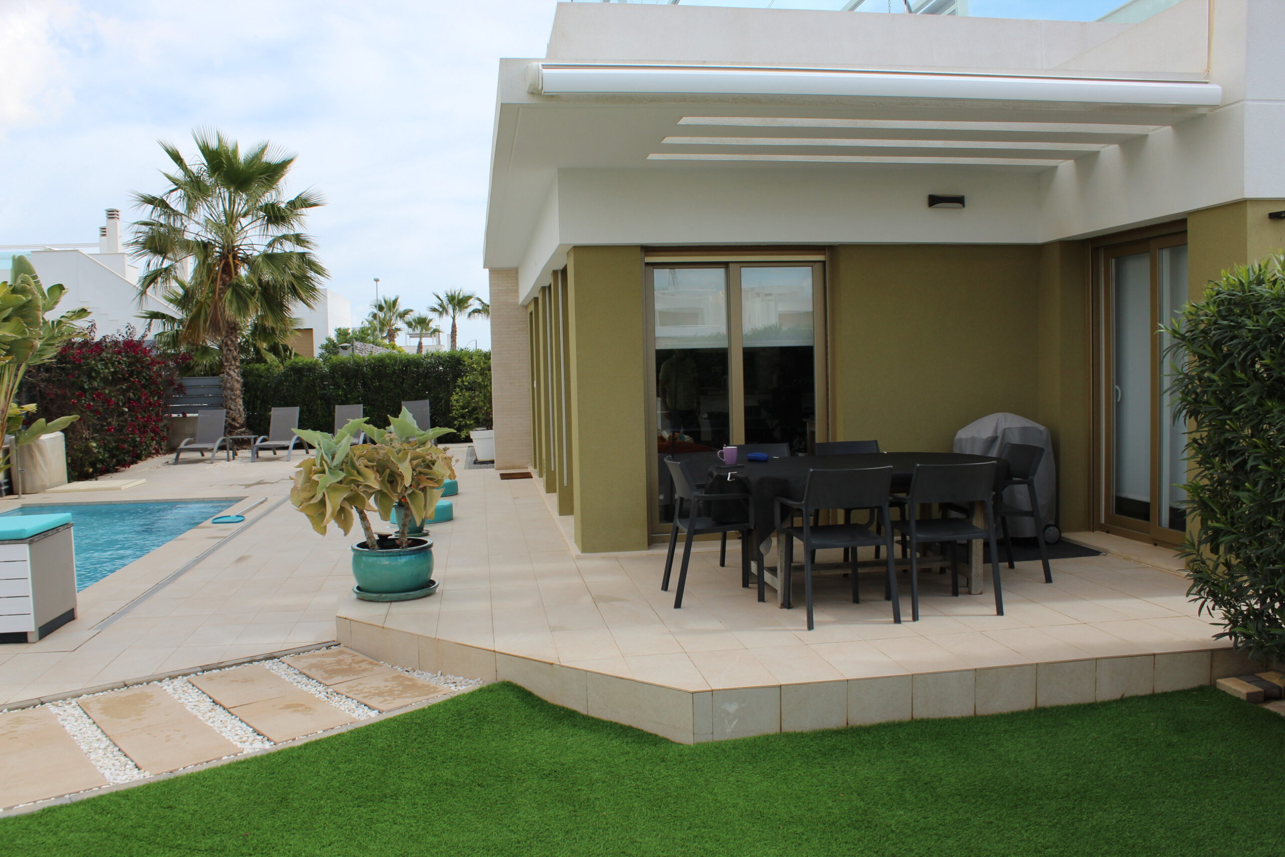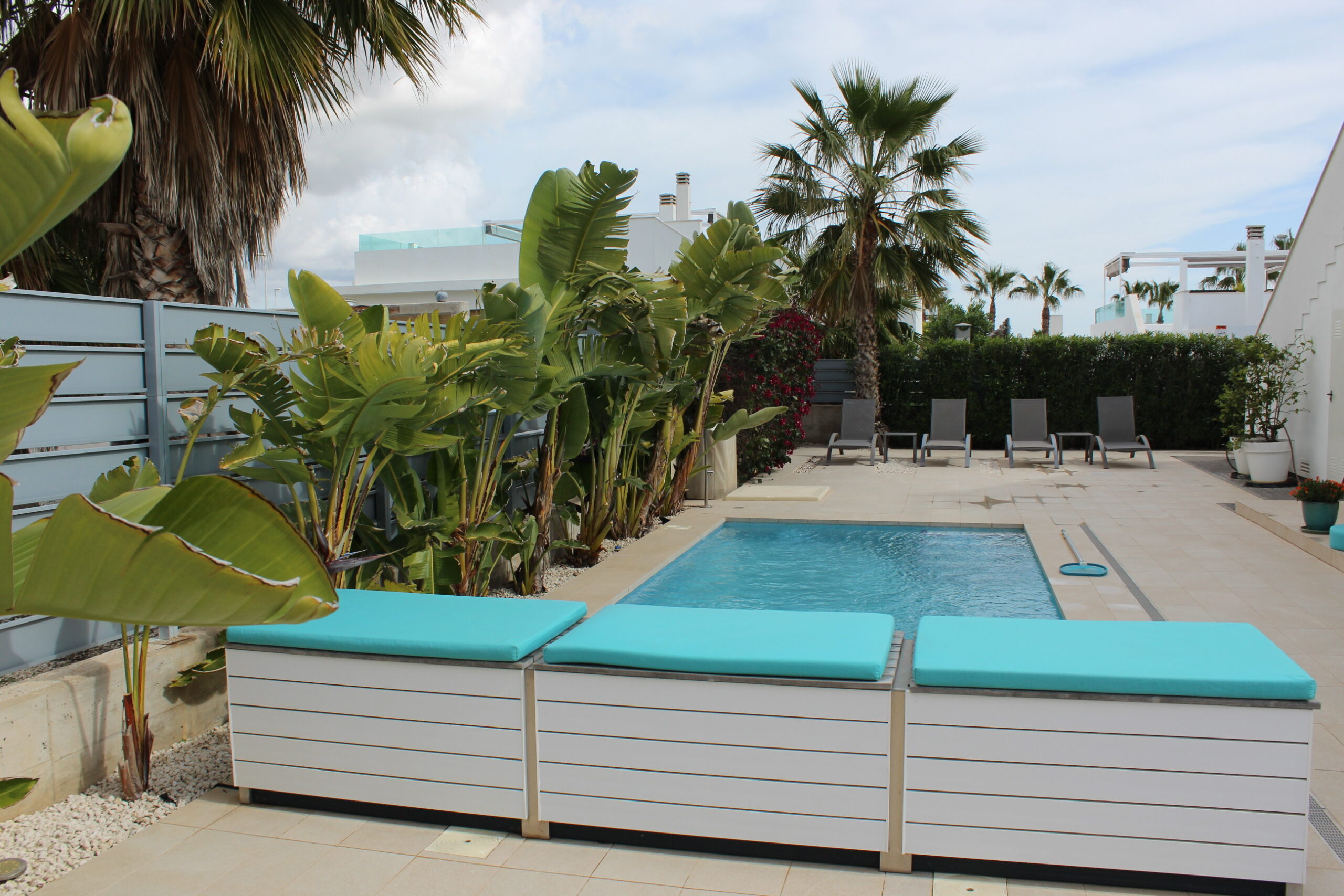 Deze prachtige ruime, moderne vrijstaande vakantievilla uit 2022 is gelegen in de wijk van Vista Bella Golf. De vakantievilla van 120 m2, beschikt over 3 slaapkamers waarvan 2 met 2 keer enkele bedden en 1 slaapkamer heeft een twee persoons bed.  Alle slaapkamers hebben inbouwkasten en een centraal geregelde airco warm en koud. De bakamers hebben een beiden een inloopdoche en zijn en-suite. De ruime woonkamer kijkt uit over het prive zwembad van 5 x 10 meter en heeft een smart TV met vele zenders, airco, modern en comfortabel meubilair. De open keuken met alle inbouw apparatuur is verbonden met de woonkamer en gescheiden door een bar. Er is ook een berging voor o.a. de wasmachine. Vanaf het ruime dakterras van 50 M2 voorzien van een loungeset en een relax-stoel, heeft u een fraai uizticht over de omgeving. U kunt hier heerijk genieten van rust en prvacy tijdens uw verblijf in deze vakantievilla. Heerlijk bij het zwembad met een cocktail.